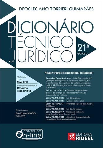 O Dicionário Técnico Jurídico, da Editora Rideel, em sua 21a edição, traz amplo conteúdo, rigorosamente atualizado com verbetes que tratam de temas atuais, com fácil visualização para agilizar a pesquisa e o estudo.