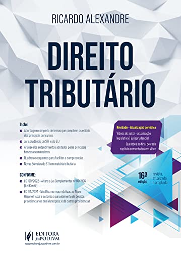 Comentários do autor em vídeos: acesso via Qr code BÔNUS: - Novidade: Atualização periódica: cadastre-se em www.editorajuspodivm.com.br/conectado - Vídeos do autor - atualização legislativa | jurisprudencial - Questões ao final de cada capítulo comentadas em vídeo O LEITOR ENCONTRARÁ: - Abordagem completa de temas que compõem os editais dos principais concursos - Jurisprudência do STF e do STJ - Análise dos entendimentos adotados pelas principais bancas examinadoras - Quadros e esquemas para facilitar a compreensão - Novas Súmulas do STJ em matéria tributária CONFORME: - LC 190/2022 – Altera a Lei Complementar nº 87/1996 (Lei Kandir) - EC 114/2021 – Modifica normas relativas ao Novo Regime Fiscal e autoriza o parcelamento de débitos previdenciários dos Municípios; e dá outras providências POR QUE ESCOLHER O LIVRO DIREITO TRIBUTÁRIO?