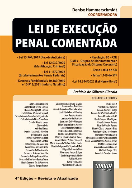 Prefácio de Gilberto Giacoia - Lei 13.964/2019 (Pacote Anticrime) - Lei 12.037/2009 (Identificação Criminal) - Lei 11.672/2008 (Estabelecimentos Penais Federais) - Decretos Presidenciais 10.189/2019 e 10.913/2021 (Indulto Natalino) - Resolução 96 - CNJ (GMFs - Grupos de Monitoramento e Fiscalização do Sistema Carcerário) - Tema 1.084 do STJ - Tema 1.169 do STF - Lei 14.344/2022 (Lei Henry Borel) A Lei de Execução Penal é daqueles diplomas normativos que, desde o seu advento, trazem uma certa vocação futurista, em perspectiva humanista, por implantar uma nova metodologia no tratamento penitenciário no Brasil, dando maior autonomia e destaque ao processo penal de execução e distanciando-o sistematicamente do processo penal de conhecimento, representando notável avanço legislativo a ponto de situar-se em posição de vanguarda em termos de direito comparado.
