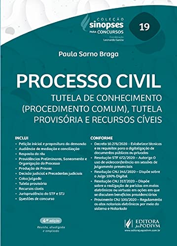O LEITOR ENCONTRARÁ: - Petição inicial e propositura da demanda - Audiência de mediação e conciliação - Resposta do réu - Providências Preliminares, Saneamento e Organização do Processo - Produção de Provas - Decisão judicial e Precedentes judiciais - Coisa julgada - Tutela provisória - Recursos cíveis - Jurisprudência do STF e STJ - Questões de concurso CONFORME: - Decreto 10.278/2020 – Estabelece técnicas e os requisitos para a digitalização de documentos públicos ou privados - Resolução STF 672/2020 – Autoriza O uso de videoconferência em sessões de julgamento presenciais - Resolução CNJ 345/2020 – Dispõe sobre o Juízo 100% Digital - Resolução CNJ 317/2020 – Dispõe sobre a realização de perícias em meios eletrônicos ou virtuais em ações em que se discutem benefícios previdenciários - Provimento CNJ 100/2020 – Regulamenta os atos notariais eletrônicos por meio do sistema e-Notariado CONHEÇA A COLEÇÃO: A Coleção Sinopses para Concursos tem por finalidade a preparação para concursos públicos de modo prático, sistematizado e objetivo.