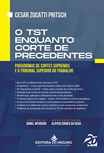 A obra procura esclarecer a estrutura, a função e a eficácia das decisões e dos precedentes do Tribunal Superior do Trabalho TST “...A adoção dos precedentes obrigatórios, a utilização do filtro da transcendência e dos recursos repetitivos, visa possibilitar a transformação da Corte superior trabalhista, como última instância infraconstitucional em matéria trabalhista, em instância de precedentes... A obra propõe uma viagem encantadora ao universo do direito positivo brasileiro, com um estudo de outros países do sistema romano germânico, como França e Itália, e ingressar no direito comparado com o modelo da common law, como no Reino Unido e nos Estados Unidos da América.