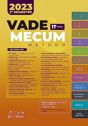 O Vade Mecum Método foi feito cuidadosamente para acompanhá-lo nas provas da OAB, graduação, concursos públicos e no seu dia a dia profissional.